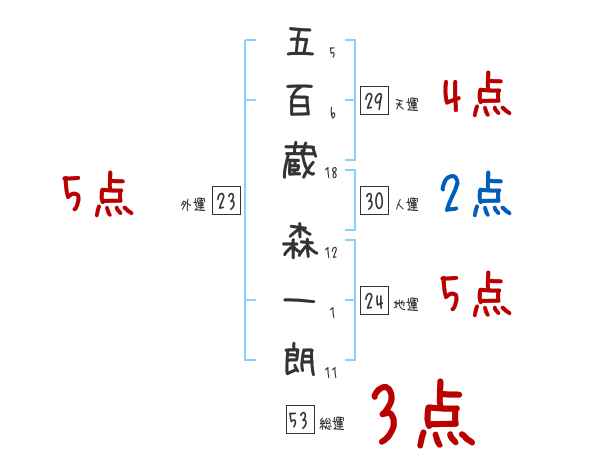総運![]() | 五百蔵森一朗さんの総運は53画の3つ星!やや見栄っ張りで虚栄心がある。散財に注意。 あなたの人生を表す1番重要な運勢です。生涯を通じて影響する総合運となり、主に50歳以降の晩年期に影響を及ぼします。 |