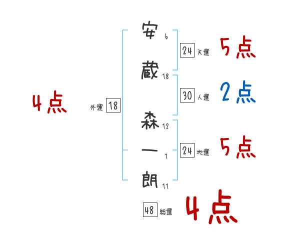 天運![]() | 安蔵森一朗さんの天運は24画の5つ星!家庭運が良く順調な人生。金運にも恵まれる。 家系が持つ宿命的な運勢を表します。祖先から受け継いだ苗字ですので自分の力が及びません。家柄を象徴します。 |
