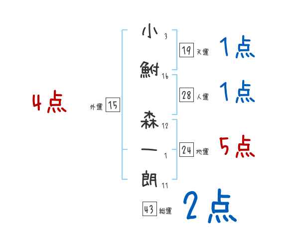 天運![]() | 小鮒森一朗さんの天運は19画の1つ星!優れた才能を持ちますが、協調性が足りないことも。周りの人と協力する事を意識しましょう。 家系が持つ宿命的な運勢を表します。祖先から受け継いだ苗字ですので自分の力が及びません。家柄を象徴します。 |