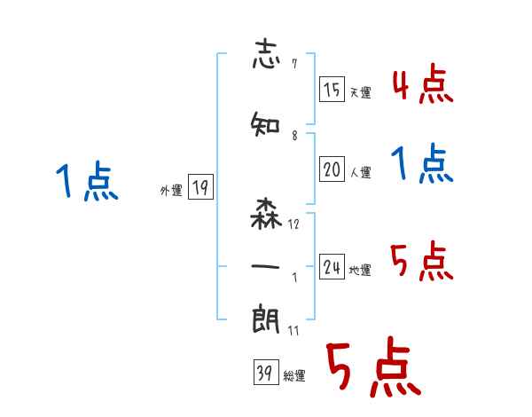 総運![]() | 志知森一朗さんの総運は39画の5つ星!社交性に優れ人望が厚い。人の上に立ち成功する。 あなたの人生を表す1番重要な運勢です。生涯を通じて影響する総合運となり、主に50歳以降の晩年期に影響を及ぼします。 |