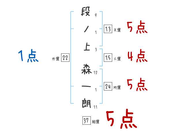 外運![]() | 段ノ上森一朗さんの外運は22画の1つ星!努力することが苦手ないっぽう手先が器用。芸術性にも優れる。 生活面を象徴する運勢です。外部から受ける影響力を表し、結婚運、家庭運や職場、環境への順応性を表します。 |