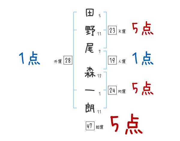 総運![]() | 田野尾森一朗さんの総運は47画の5つ星!実力が開花し発展する円満な人生。財に恵まれる。 あなたの人生を表す1番重要な運勢です。生涯を通じて影響する総合運となり、主に50歳以降の晩年期に影響を及ぼします。 |