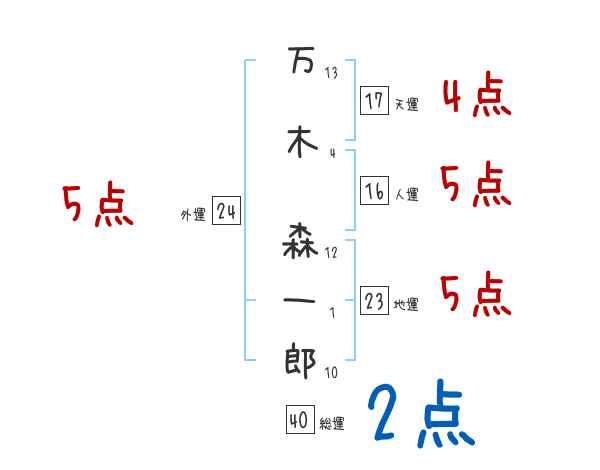人運![]() | 万木森一郎さんの人運は16画の5つ星!人望が厚く大きく発展する。逆転成功が見える。 性格や才能などを表す2番目に重要な運勢です。人間関係や協調性、社会的な成功に影響します。主に20歳から50歳ぐらいまでの中年期の運勢を表します。 |