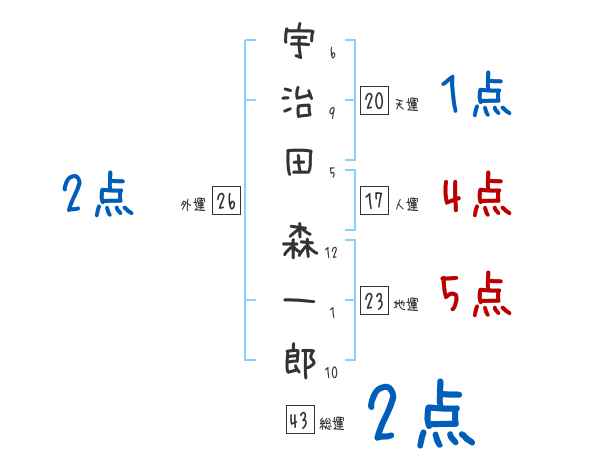総運![]() | 宇治田森一郎さんの総運は43画の2つ星!頑固な性格で独立心が強いかも。やや非現実的で浪費に注意しましょう。 あなたの人生を表す1番重要な運勢です。生涯を通じて影響する総合運となり、主に50歳以降の晩年期に影響を及ぼします。 |