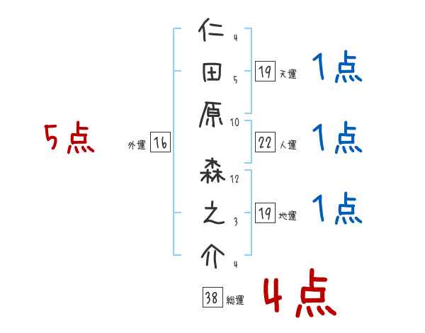 外運![]() | 仁田原森之介さんの外運は16画の5つ星!人望が厚く大きく発展する。逆転成功が見える。 生活面を象徴する運勢です。外部から受ける影響力を表し、結婚運、家庭運や職場、環境への順応性を表します。 |