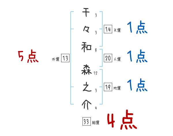 総運![]() | 千々和森之介さんの総運は33画の4つ星!権力志向でプライドが高い。勇気があり運を切り開き成功する。 あなたの人生を表す1番重要な運勢です。生涯を通じて影響する総合運となり、主に50歳以降の晩年期に影響を及ぼします。 |