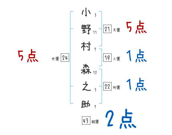 天運![]() | 小野村森之助さんの天運は21画の5つ星!統率力がある。独立し成功する。名誉を手に入れる。 家系が持つ宿命的な運勢を表します。祖先から受け継いだ苗字ですので自分の力が及びません。家柄を象徴します。 |