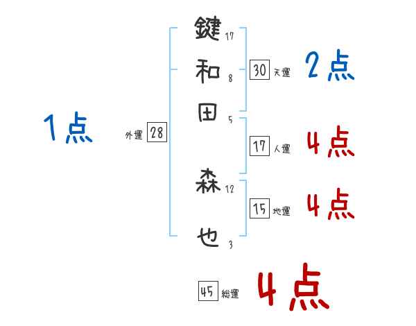 天運![]() | 鍵和田森也さんの天運は30画の2つ星!浮き沈みの激しさに注意しましょう。 家系が持つ宿命的な運勢を表します。祖先から受け継いだ苗字ですので自分の力が及びません。家柄を象徴します。 |