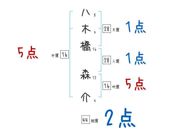 | 天運  | 八木橋森介さんの天運は28画の1つ星!家庭環境に注意。スポーツで活躍できる能力があるかも。家系が持つ宿命的な運勢を表します。祖先から受け継いだ苗字ですので自分の力が及びません。家柄を象徴します。 |
