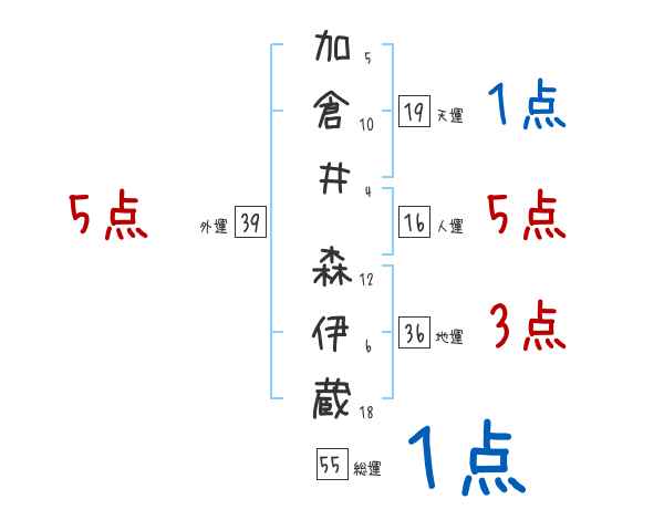 外運![]() | 加倉井森伊蔵さんの外運は39画の5つ星!社交性に優れ人望が厚い。人の上に立ち成功する。 生活面を象徴する運勢です。外部から受ける影響力を表し、結婚運、家庭運や職場、環境への順応性を表します。 |