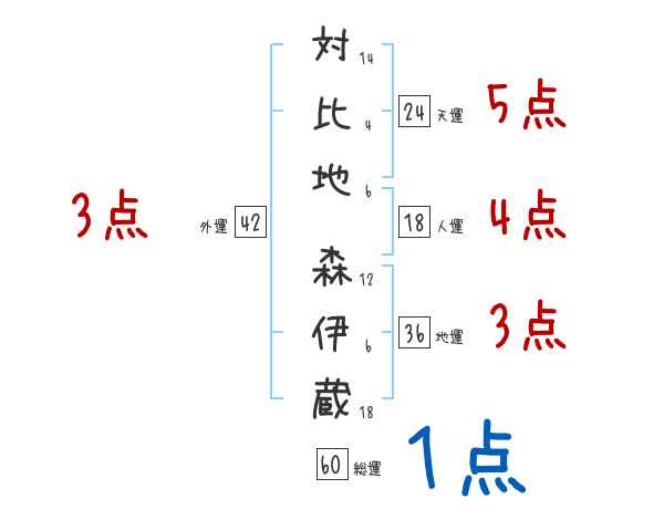 外運![]() | 対比地森伊蔵さんの外運は42画の3つ星!病気に注意。多芸であるが消極的でおとなしい。 生活面を象徴する運勢です。外部から受ける影響力を表し、結婚運、家庭運や職場、環境への順応性を表します。 |