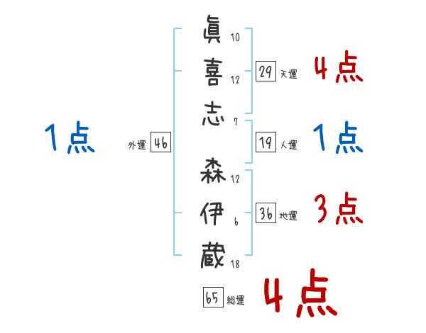地運![]() | 眞喜志森伊蔵さんの地運は36画の3つ星!先見性が豊かです。多少神経質で苦労することも。 個性を表す基礎的な運勢です。性格形成や対人関係、行動力など家庭環境に影響されます。主に誕生してから20歳くらいまでの若年期の運勢を表します。 |