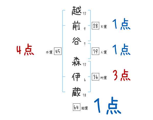 外運![]() | 越前谷森伊蔵さんの外運は45画の4つ星!もくもくと物事を進め達成する。地味な努力家。 生活面を象徴する運勢です。外部から受ける影響力を表し、結婚運、家庭運や職場、環境への順応性を表します。 |