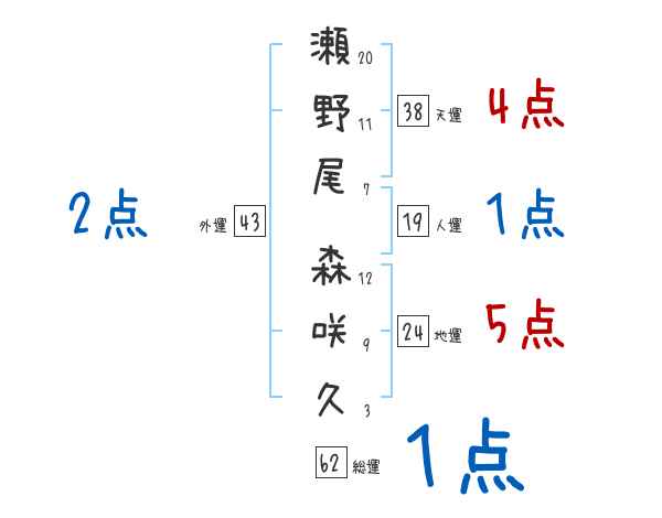 人運![]() | 瀬野尾森咲久さんの人運は19画の1つ星!優れた才能を持ちますが、協調性が足りないことも。周りの人と協力する事を意識しましょう。 性格や才能などを表す2番目に重要な運勢です。人間関係や協調性、社会的な成功に影響します。主に20歳から50歳ぐらいまでの中年期の運勢を表します。 |