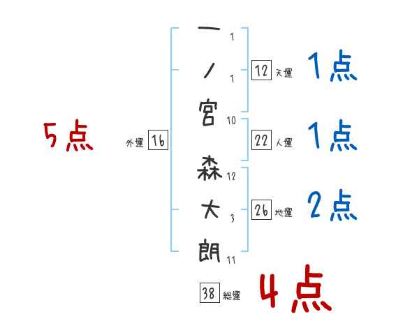 人運![]() | 一ノ宮森大朗さんの人運は22画の1つ星!努力することが苦手ないっぽう手先が器用。芸術性にも優れる。 性格や才能などを表す2番目に重要な運勢です。人間関係や協調性、社会的な成功に影響します。主に20歳から50歳ぐらいまでの中年期の運勢を表します。 |