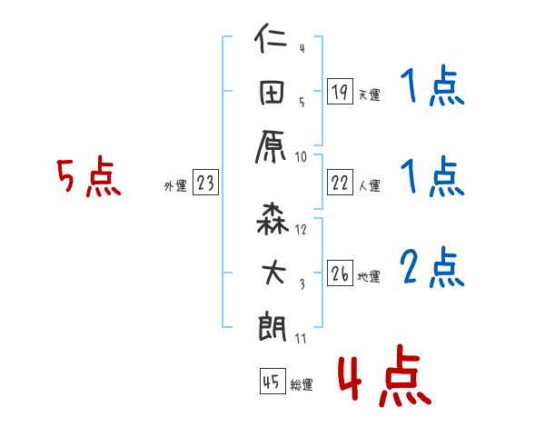 天運![]() | 仁田原森大朗さんの天運は19画の1つ星!優れた才能を持ちますが、協調性が足りないことも。周りの人と協力する事を意識しましょう。 家系が持つ宿命的な運勢を表します。祖先から受け継いだ苗字ですので自分の力が及びません。家柄を象徴します。 |