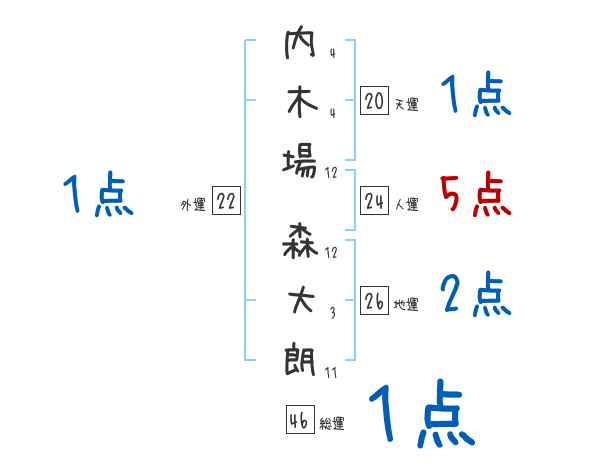 総運![]() | 内木場森大朗さんの総運は46画の1つ星!迷走することが多く苦労するかも。目先のことにとらわれないように。 あなたの人生を表す1番重要な運勢です。生涯を通じて影響する総合運となり、主に50歳以降の晩年期に影響を及ぼします。 |