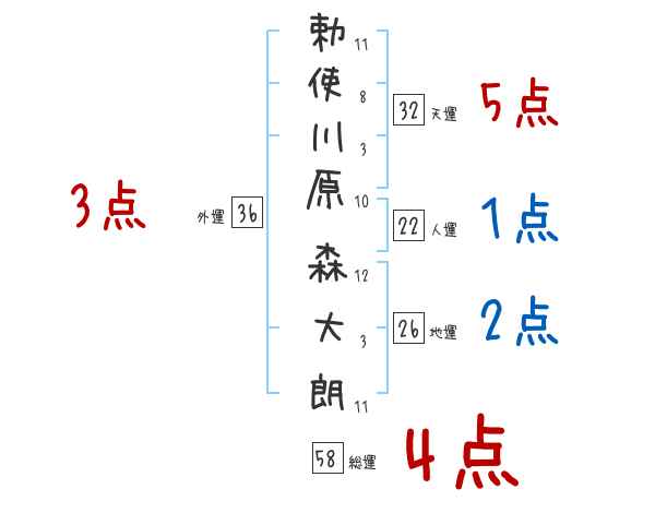 天運![]() | 勅使川原森大朗さんの天運は32画の5つ星!柔軟性があり成功する。チャンスが多く金運が良い。 家系が持つ宿命的な運勢を表します。祖先から受け継いだ苗字ですので自分の力が及びません。家柄を象徴します。 |