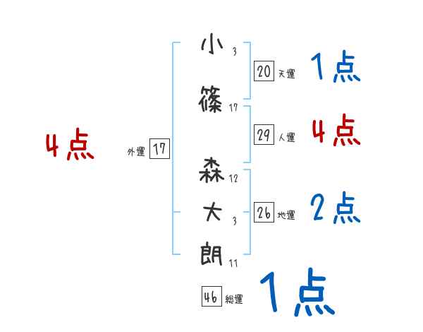 外運![]() | 小篠森大朗さんの外運は17画の4つ星!積極的な行動力。地位を気づき財産を手に入れる。純粋な心と直感力。 生活面を象徴する運勢です。外部から受ける影響力を表し、結婚運、家庭運や職場、環境への順応性を表します。 |