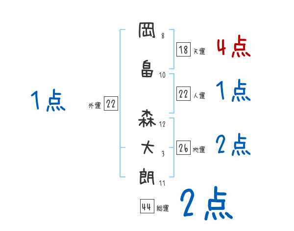 外運![]() | 岡畠森大朗さんの外運は22画の1つ星!努力することが苦手ないっぽう手先が器用。芸術性にも優れる。 生活面を象徴する運勢です。外部から受ける影響力を表し、結婚運、家庭運や職場、環境への順応性を表します。 |