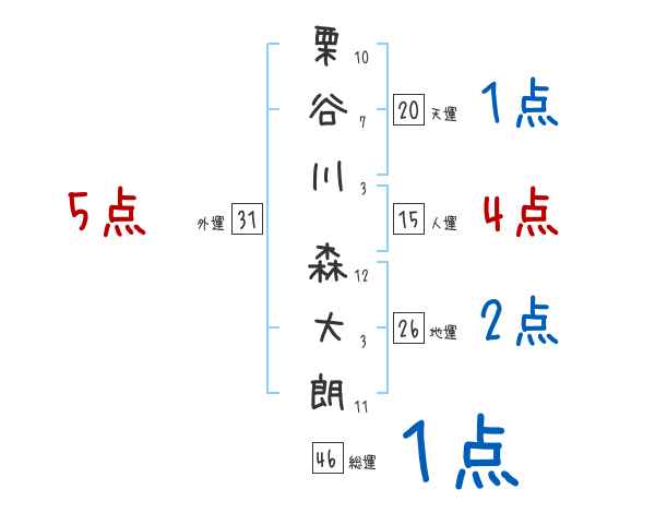 外運![]() | 栗谷川森大朗さんの外運は31画の5つ星!社交性があり判断力に優れる。順風満帆な人生で円満な生活。 生活面を象徴する運勢です。外部から受ける影響力を表し、結婚運、家庭運や職場、環境への順応性を表します。 |