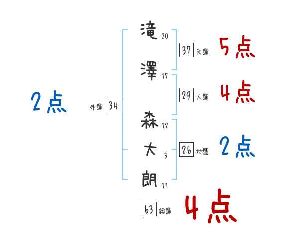 総運![]() | 滝澤森大朗さんの総運は63画の4つ星!家庭運がよく順調な生活。温和な性格。 あなたの人生を表す1番重要な運勢です。生涯を通じて影響する総合運となり、主に50歳以降の晩年期に影響を及ぼします。 |