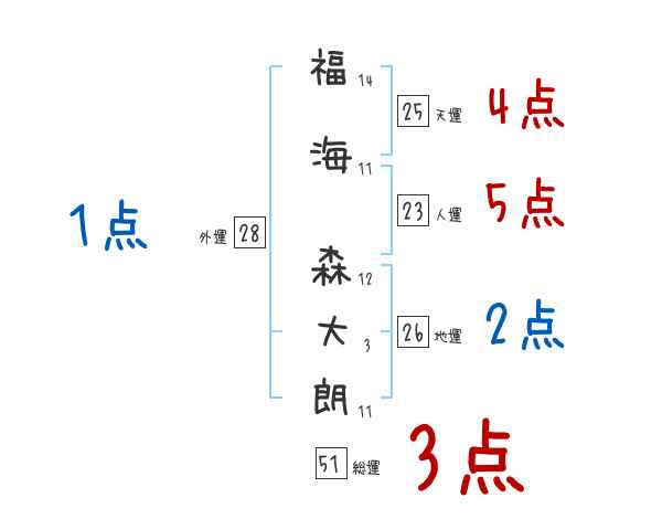 外運![]() | 福海森大朗さんの外運は28画の1つ星!家庭環境に注意。スポーツで活躍できる能力があるかも。 生活面を象徴する運勢です。外部から受ける影響力を表し、結婚運、家庭運や職場、環境への順応性を表します。 |