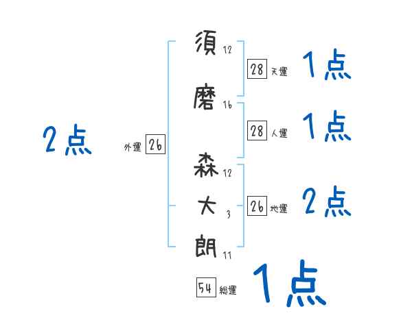天運![]() | 須磨森大朗さんの天運は28画の1つ星!家庭環境に注意。スポーツで活躍できる能力があるかも。 家系が持つ宿命的な運勢を表します。祖先から受け継いだ苗字ですので自分の力が及びません。家柄を象徴します。 |