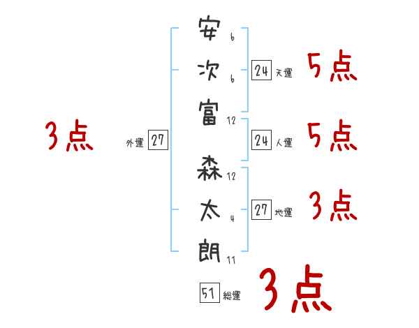 天運![]() | 安次富森太朗さんの天運は24画の5つ星!家庭運が良く順調な人生。金運にも恵まれる。 家系が持つ宿命的な運勢を表します。祖先から受け継いだ苗字ですので自分の力が及びません。家柄を象徴します。 |