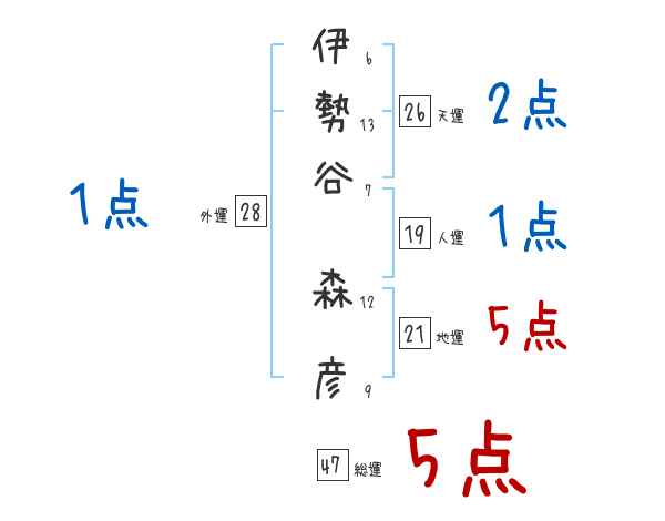天運![]() | 伊勢谷森彦さんの天運は26画の2つ星!波瀾万丈かも。信頼できる人を大事にしましょう。 家系が持つ宿命的な運勢を表します。祖先から受け継いだ苗字ですので自分の力が及びません。家柄を象徴します。 |
