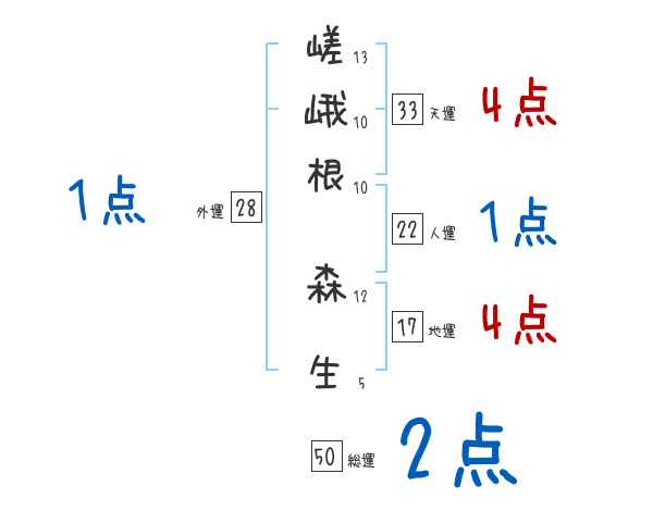天運![]() | 嵯峨根森生さんの天運は33画の4つ星!権力志向でプライドが高い。勇気があり運を切り開き成功する。 家系が持つ宿命的な運勢を表します。祖先から受け継いだ苗字ですので自分の力が及びません。家柄を象徴します。 |