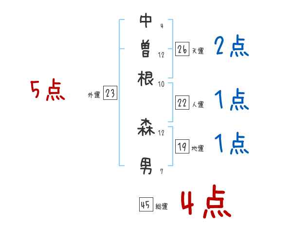 外運![]() | 中曽根森男さんの外運は23画の5つ星!想像力に優れ活力がある。一代で成功し名誉を手に入れる。 生活面を象徴する運勢です。外部から受ける影響力を表し、結婚運、家庭運や職場、環境への順応性を表します。 |