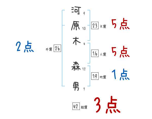 人運![]() | 河原木森男さんの人運は16画の5つ星!人望が厚く大きく発展する。逆転成功が見える。 性格や才能などを表す2番目に重要な運勢です。人間関係や協調性、社会的な成功に影響します。主に20歳から50歳ぐらいまでの中年期の運勢を表します。 |