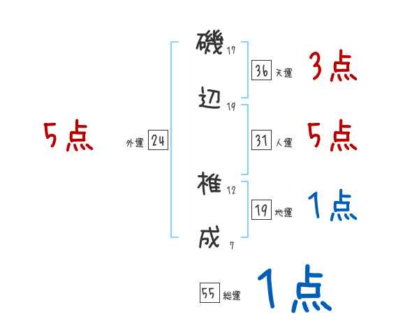 外運![]() | 磯辺椎成さんの外運は24画の5つ星!家庭運が良く順調な人生。金運にも恵まれる。 生活面を象徴する運勢です。外部から受ける影響力を表し、結婚運、家庭運や職場、環境への順応性を表します。 |
