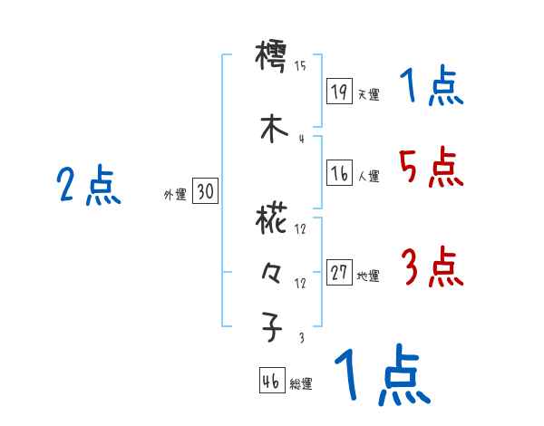 人運![]() | 樗木椛々子さんの人運は16画の5つ星!人望が厚く大きく発展する。逆転成功が見える。 性格や才能などを表す2番目に重要な運勢です。人間関係や協調性、社会的な成功に影響します。主に20歳から50歳ぐらいまでの中年期の運勢を表します。 |