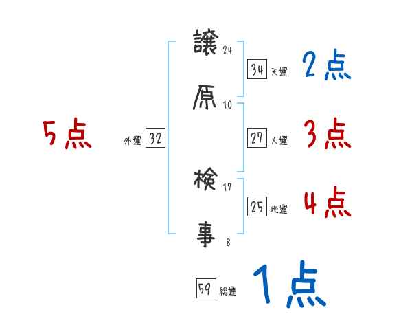 外運![]() | 譲原検事さんの外運は32画の5つ星!柔軟性があり成功する。チャンスが多く金運が良い。 生活面を象徴する運勢です。外部から受ける影響力を表し、結婚運、家庭運や職場、環境への順応性を表します。 |