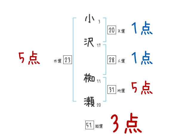 総運![]() | 小沢椥瀬さんの総運は51画の3つ星!変化が激しく、危険に注意。堅実な性格。 あなたの人生を表す1番重要な運勢です。生涯を通じて影響する総合運となり、主に50歳以降の晩年期に影響を及ぼします。 |