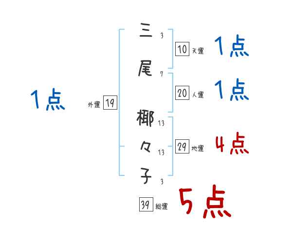 天運![]() | 三尾椰々子さんの天運は10画の1つ星!不安を感じやすい傾向。ストレスを抱えないように注意しましょう。 家系が持つ宿命的な運勢を表します。祖先から受け継いだ苗字ですので自分の力が及びません。家柄を象徴します。 |