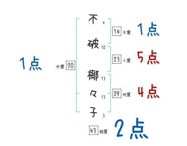 人運![]() | 不破椰々子さんの人運は23画の5つ星!想像力に優れ活力がある。一代で成功し名誉を手に入れる。 性格や才能などを表す2番目に重要な運勢です。人間関係や協調性、社会的な成功に影響します。主に20歳から50歳ぐらいまでの中年期の運勢を表します。 |