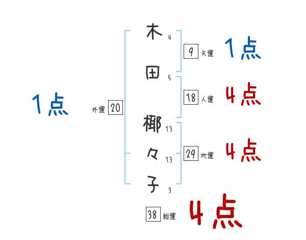 天運![]() | 木田椰々子さんの天運は9画の1つ星!消極的で才能を発揮することが苦手なことも。周りの意見に耳を傾けましょう。 家系が持つ宿命的な運勢を表します。祖先から受け継いだ苗字ですので自分の力が及びません。家柄を象徴します。 |