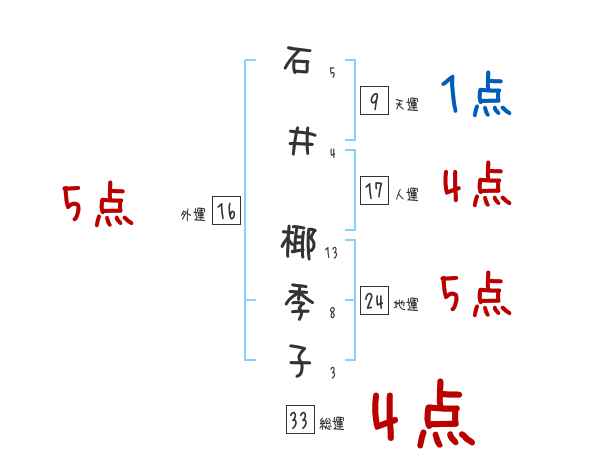 外運![]() | 石井椰季子さんの外運は16画の5つ星!人望が厚く大きく発展する。逆転成功が見える。 生活面を象徴する運勢です。外部から受ける影響力を表し、結婚運、家庭運や職場、環境への順応性を表します。 |