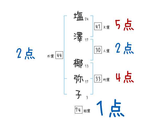 天運![]() | 塩澤椰弥子さんの天運は41画の5つ星!大志を抱き、目標に向かって実力を発揮し達成する。温和な性格。 家系が持つ宿命的な運勢を表します。祖先から受け継いだ苗字ですので自分の力が及びません。家柄を象徴します。 |