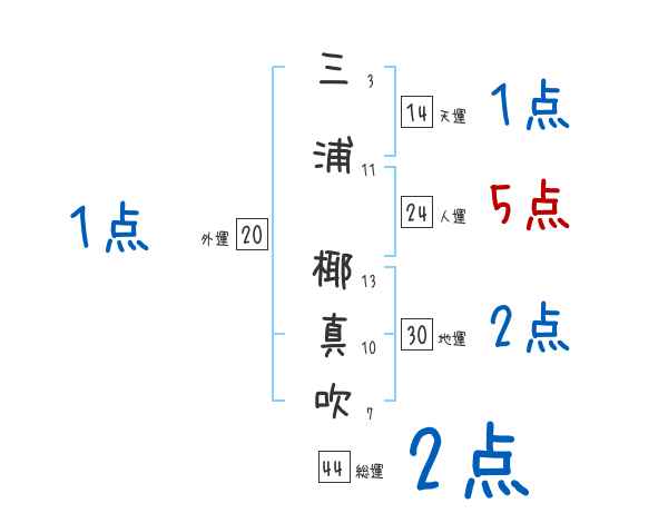 天運![]() | 三浦椰真吹さんの天運は14画の1つ星!人に対して優しいがストレスを溜め込みがち。人間関係のトラブルを避けるよう気をつけましょう。 家系が持つ宿命的な運勢を表します。祖先から受け継いだ苗字ですので自分の力が及びません。家柄を象徴します。 |