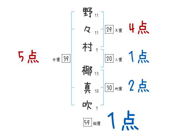 外運![]() | 野々村椰真吹さんの外運は39画の5つ星!社交性に優れ人望が厚い。人の上に立ち成功する。 生活面を象徴する運勢です。外部から受ける影響力を表し、結婚運、家庭運や職場、環境への順応性を表します。 |