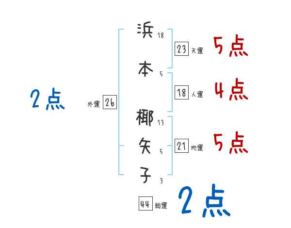総運![]() | 浜本椰矢子さんの総運は44画の2つ星!誠実で慎重な性格。物事を考えすぎないように注意しましょう。 あなたの人生を表す1番重要な運勢です。生涯を通じて影響する総合運となり、主に50歳以降の晩年期に影響を及ぼします。 |