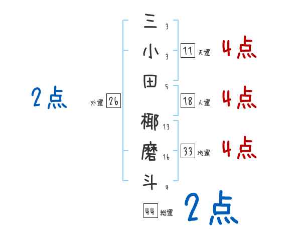 総運![]() | 三小田椰磨斗さんの総運は44画の2つ星!誠実で慎重な性格。物事を考えすぎないように注意しましょう。 あなたの人生を表す1番重要な運勢です。生涯を通じて影響する総合運となり、主に50歳以降の晩年期に影響を及ぼします。 |