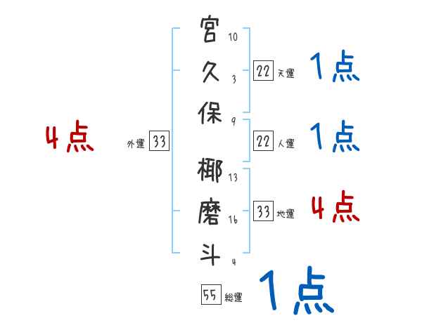 外運![]() | 宮久保椰磨斗さんの外運は33画の4つ星!権力志向でプライドが高い。勇気があり運を切り開き成功する。 生活面を象徴する運勢です。外部から受ける影響力を表し、結婚運、家庭運や職場、環境への順応性を表します。 |