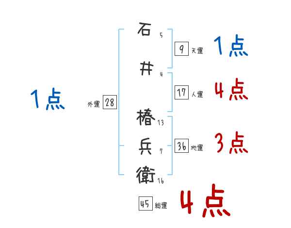 天運![]() | 石井椿兵衛さんの天運は9画の1つ星!消極的で才能を発揮することが苦手なことも。周りの意見に耳を傾けましょう。 家系が持つ宿命的な運勢を表します。祖先から受け継いだ苗字ですので自分の力が及びません。家柄を象徴します。 |