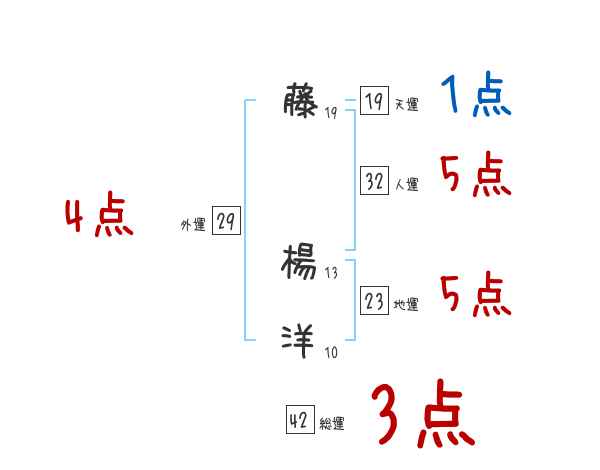 外運![]() | 藤楊洋さんの外運は29画の4つ星!完全主義で才能がある。厳格な心の持ち主。 生活面を象徴する運勢です。外部から受ける影響力を表し、結婚運、家庭運や職場、環境への順応性を表します。 |