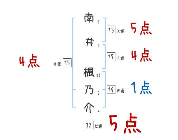 総運![]() | 南井楓乃介さんの総運は32画の5つ星!柔軟性があり成功する。チャンスが多く金運が良い。 あなたの人生を表す1番重要な運勢です。生涯を通じて影響する総合運となり、主に50歳以降の晩年期に影響を及ぼします。 |
